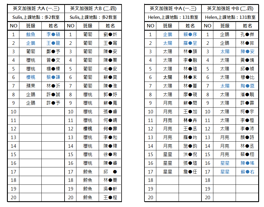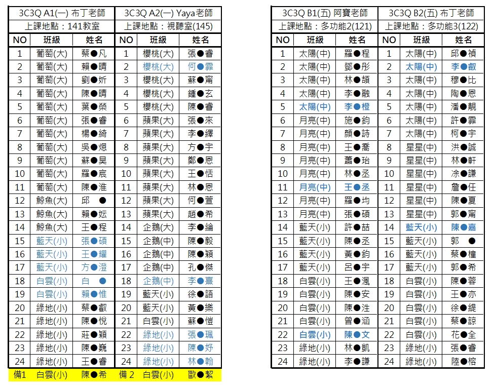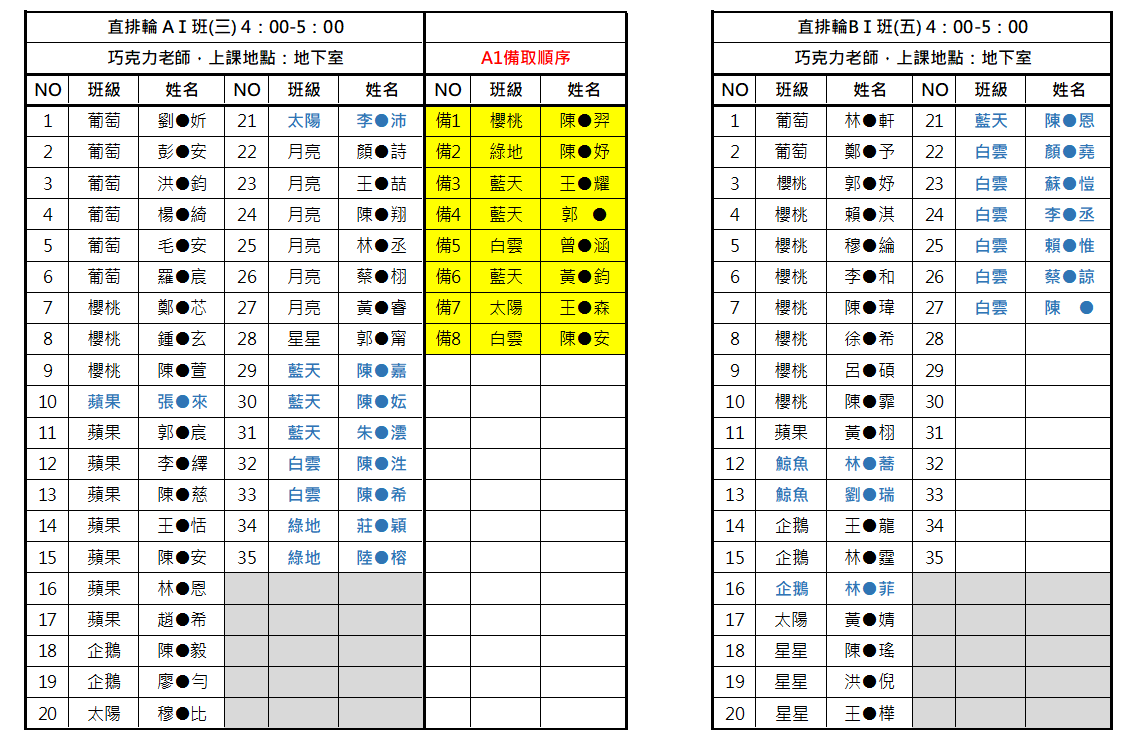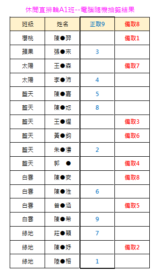 **A1班原有6個名額,因有人退出,增加名額至9位。報名人數17人,抽出正取9位、備取8位(有名額再遞補)。電腦隨機抽籤結果→→A1班抽籤結果.png