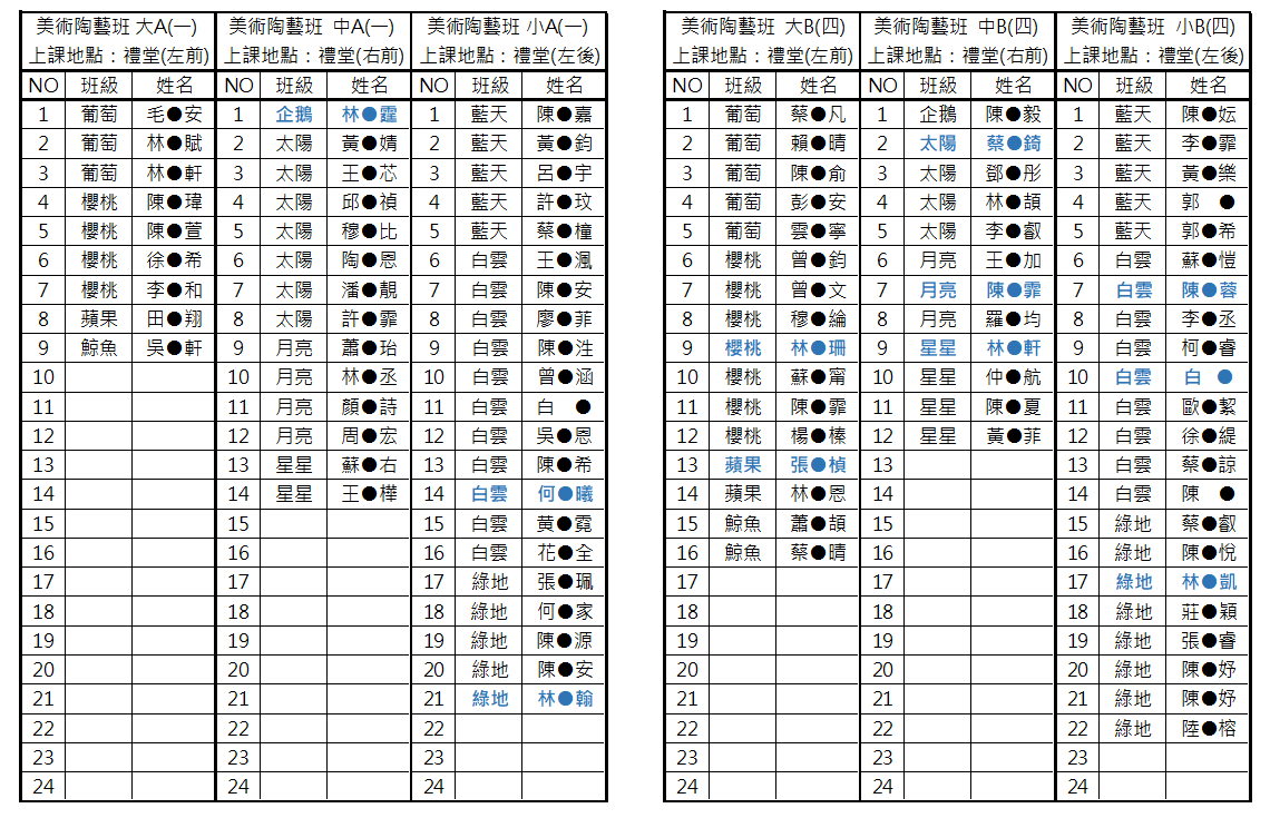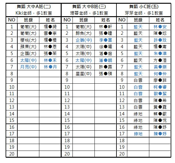 04 舞蹈律動班--已登記加購舞蹈用品:藍天/林●安、許●玟、朱●澐、黃●樂、何●仲;白雲/柯●睿、歐●絜。