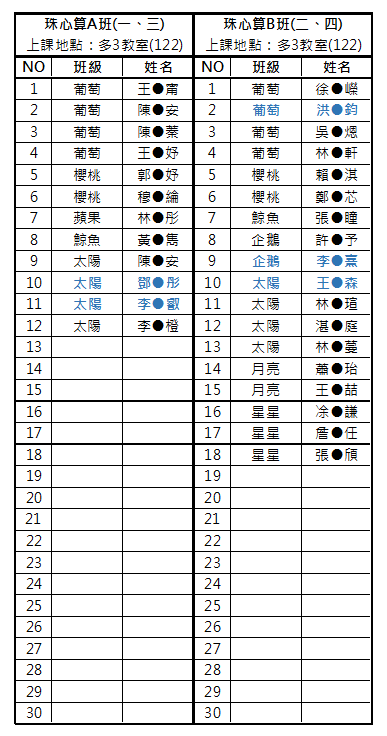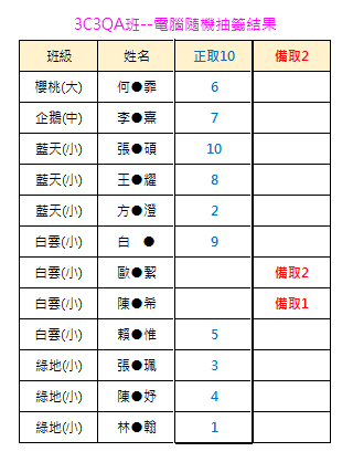 **A班原有1個名額,因有人退出,增加名額至10位。報名人數12人,抽出正取10位、備取2位(有名額再遞補)。電腦隨機抽籤結果→→A班抽籤結果.png